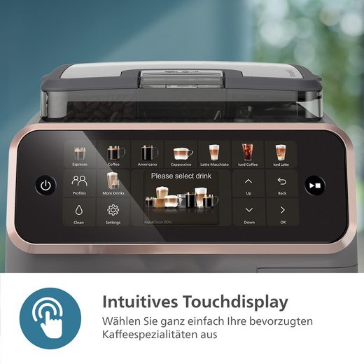 Kaffeevollautomat EP5544/80 der Serie 5500 in der Farbkombination Grau/Kupfer, ausgestattet mit dem LatteGo-Milchsystem und der SilentBrew-Technologie, bietet zwanzig verschiedene Kaffeespezialitäten